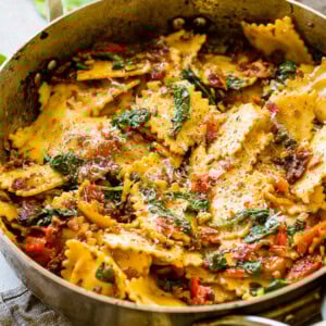 Unless otherwise stated, please always buy the jars of oil-packed sun dried tomatoes. They are more flavorful and that oil is used on the pasta so don’t buy the dried!