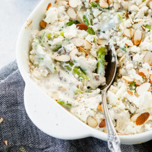 This twist on a traditional green bean casserole recipe is creamy and delicious! The feta cheese adds such a nice flavor and the almonds add the crunch we all love.