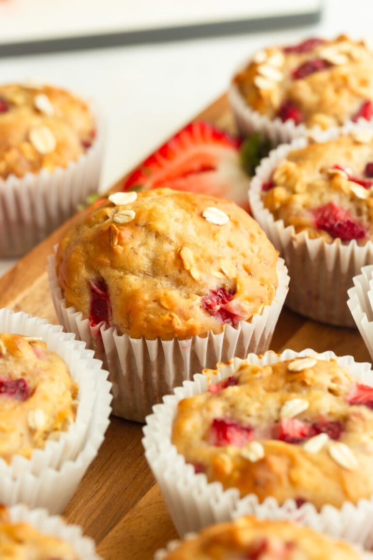 This muffin project went through several versions before we landed on the strawberry ones. We tried blueberry oatmeal, banana oat, brown sugar cinnamon oat, and chocolate chip oatmeal muffins, but the strawberry version was our favorite. The texture is perfect, the flavor is fresh and bright, and those tall, bakery-style muffin tops make them irresistible.