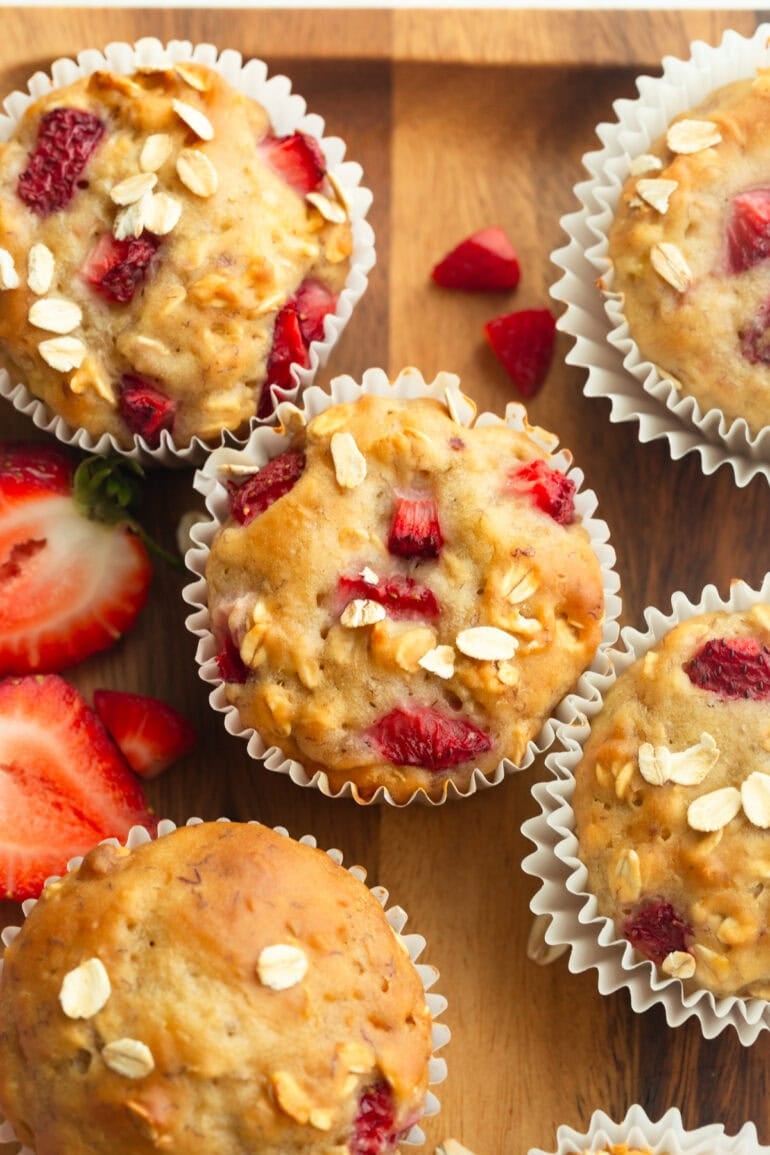 Normally I’m a huge fan of freeze dried fruit in baked goods like our white chocolate raspberry cookies, and the BEST, CREAMIEST homemade strawberry ice cream recipe, but not this time. Because this muffin recipe skips the oil and adds in old fashioned oats they end up lacking a little moisture which the fresh strawberries add.