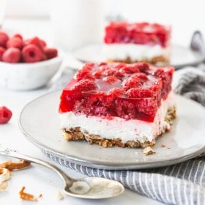 Team raspberry? Team strawberry? It actually doesn’t matter at all! They are all so dang good, and fresh berries means summer which I’m totally craving! This also makes the perfect side dish for Thanksgiving or Christmas. Make raspberry jello pretzel salad as a side dish for your next shindig!!
