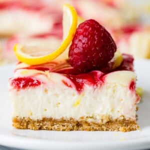 Swirled raspberry lemon cheesecake bars are my new favorite dessert! The creamiest lemon cheesecake swirled with fresh raspberries and a sweet graham cracker crust! Yes, please!