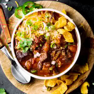 Freshly Browned Brisket - Bring the chili to a simmer for 30 minutes over medium high heat, then set the heat to medium low and allow to continue cooking for 4-5 hours. Don't be tempted to stop at hour 3 even though the meat is looking tender, 4-5 hours is the key.Total time: 4.5-5.5 hours