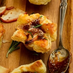 Roll out the puff pastry sheets and then cut in thirds and then cut in thirds the opposite ways to create 9 perfect squares from each sheet (18 square total). Press the squares of puff pastry into a mini muffin tin.