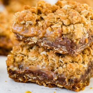 are dessert bars that have a brown sugar buttery oat bottom, a melty chocolate and rich caramel center topped off with another layer of oat crumble!