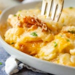 This Cheesy Potato Casserole features layers upon layers of thinly sliced potatoes, a creamy cheese sauce, and extra cheese on top! Easily my favorite potato side dish!