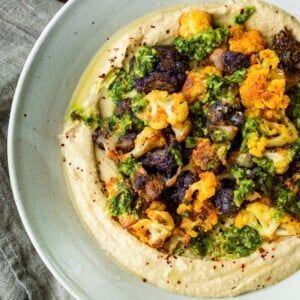 Serve on top of our homemade hummus, with a drizzle of our homemade pesto and a sprinkle of Aleppo pepper and flaked sea salt.