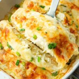 ! Tender shredded chicken wrapped in soft flour tortillas, smothered in a creamy sauce made completely from scratch, and baked to golden perfection.
