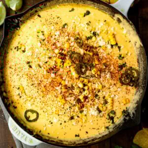 Prepare to have your life changed by this Elote Mexican Street Corn Queso Dip Recipe! Inspired by Mexican grilled corn, my mix of Mexican cheeses, jalapeño, and sweet corn makes the most delicious party dip!