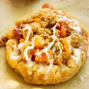 Peach crisp cookies that LITERALLY taste like a mash-up between peach cobbler, thanks to that cinnamon sugar cookie base, and peach crisp, thanks to the buttery oatmeal topping.