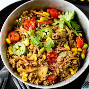 This easy Taco Skillet is loaded with all your favorite taco flavors, but made into a quick and easy stir-fry. It will quickly become a new family weeknight dinner favorite!